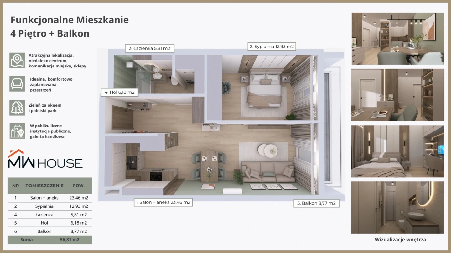 Mieszkanie jest bardzo funkcjonalne i posiada duży potencjał, umożliwiający dogodne zaplanowanie pomieszczeń wraz z ich codziennymi funkcjami. Przemyślany rozkład dwóch pokoi daje szerokie możliwości aranżacyjne – przestronny salon (20,04 m²) z aneksem kuchennym (5,56 m²) sprzyja wspólnemu spędzaniu czasu, drugi pokój (12,93 m²), idealnie sprawdzi się jako sypialnia, pokój dziecięcy lub przestrzeń do realizacji pasji. Mieszkanie jest ustawne, jasne i zapewnia komfort użytkowania zarówno rodzinie, jak i osobom ceniącym prywatność. Lokal posiada ekspozycję południową.